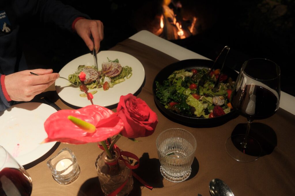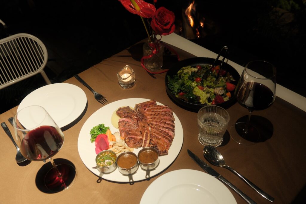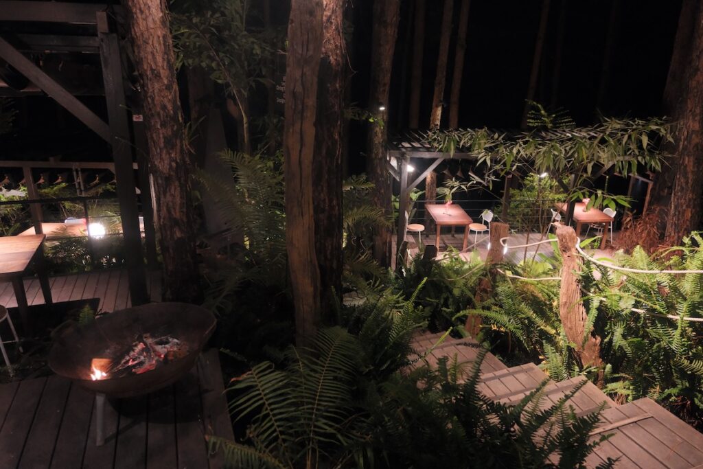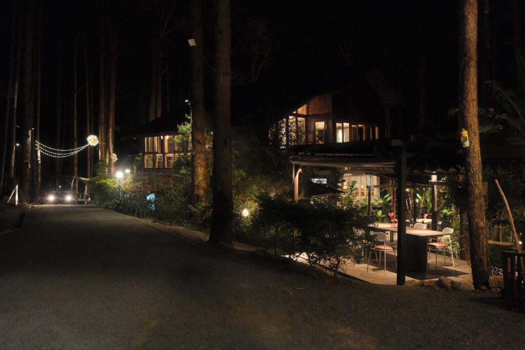 The charm of Rừng Thông Mơ Farm & Bistro is best felt as the evening settles in. The journey from villa to bistro is handled via a private cart from reception, delivering you into a landscape of flickering lamps and forest quiet. The restaurant team does an excellent job of preparing the outdoor area, ensuring each table has its own fire to combat the cooling night. It is an intimate setup that feels a world away from the bustle of the city, provided you have booked your table in advance.